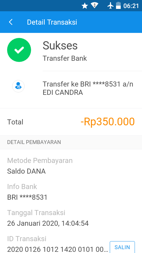 10. Dan, selesai. Kamu telah berhasil melakukan transaksi Transfer Saldo Dana ke Rekening Bank.