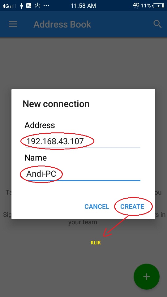 3. Setelah kamu mengetahui IP Address pada Laptop atau PC kamu, selanjutnya buka VNC Viewer di HP Android kamu, dan lengkapi IP dan nama Laptop atau PC yang ingin kamu remote. Penulis akan melengkapi IP 192.168.43.107 dengan nama Andi-PC. Setelah kamu lengkapi kemudian klik CREATE.