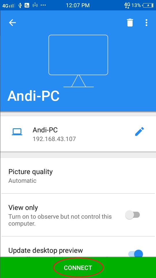 5. Setelah kamu atur IP beserta nama Laptop atau PC yang ingin kamu remote, selanjutnya klik CONNECT pada VNC Viewer di smartphone Android kamu.