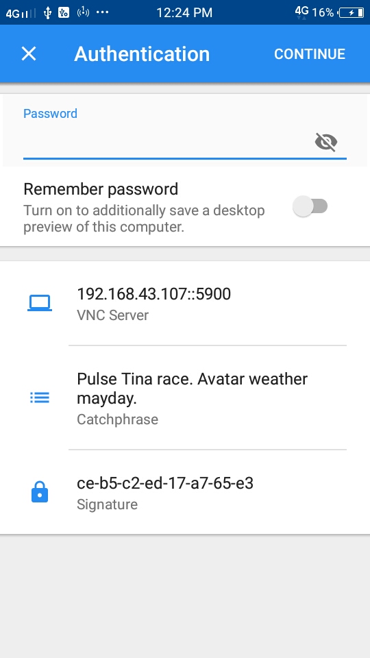 6. Terakhir, isi password yang diminta VNC Viewer di HP Android kamu, isikan password yang sama dengan VNC Server di Laptop atau PC kamu tadi dan klik CONTINUE.