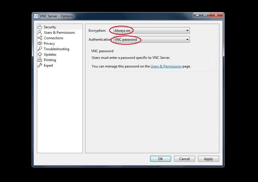 lalu atur Encryption dengan Always On dan atur Authentication dengan VNC Password. Selanjutnya isi password sesuai keinginan kamu lalu klik OK.