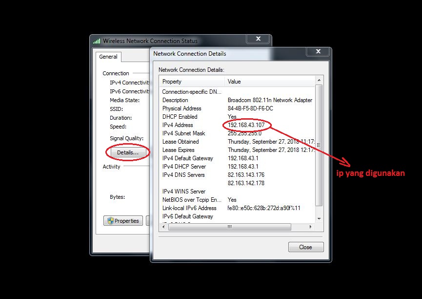 2. Gunakan IP Address Laptop atau PC kamu dengan cara melihat details pada internet koneksi kamu, disini penulis akan menggunakan IP 192.168.43.107. Lebih lengkapnya bisa kamu lihat pada gambar di bawah ini.