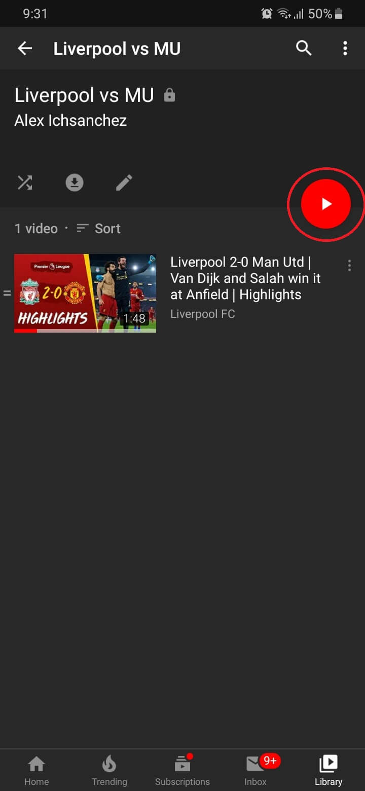8. Playlist kamu sedang ditampilkan. Lalu tap icon “Play” berwarna merah untuk memainkan playlist.