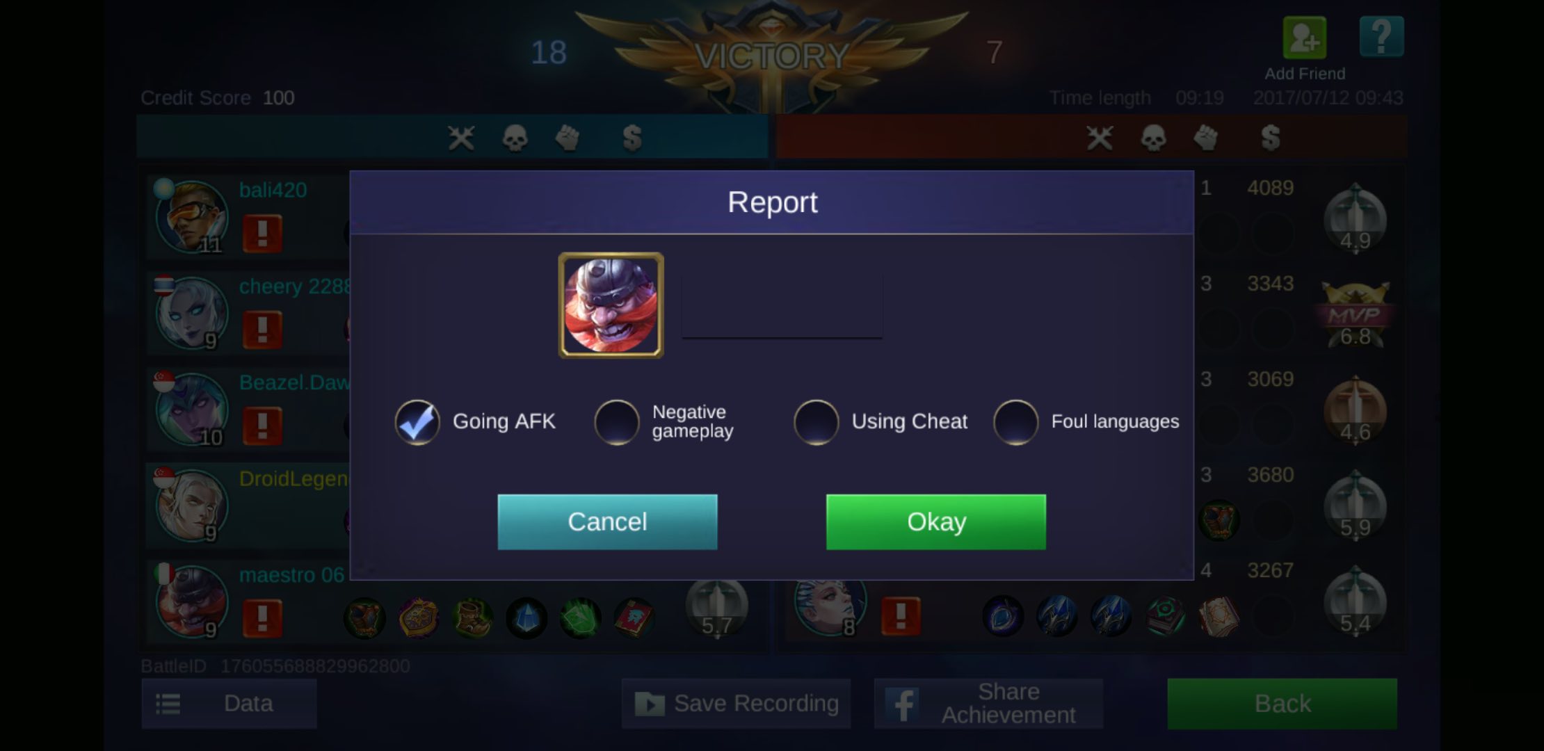 • Pilih Going AFK jika pemain tersebut sering disconnect atau keluar dari permainan saat pertandingan berlangsung.