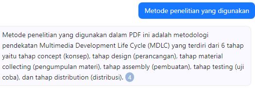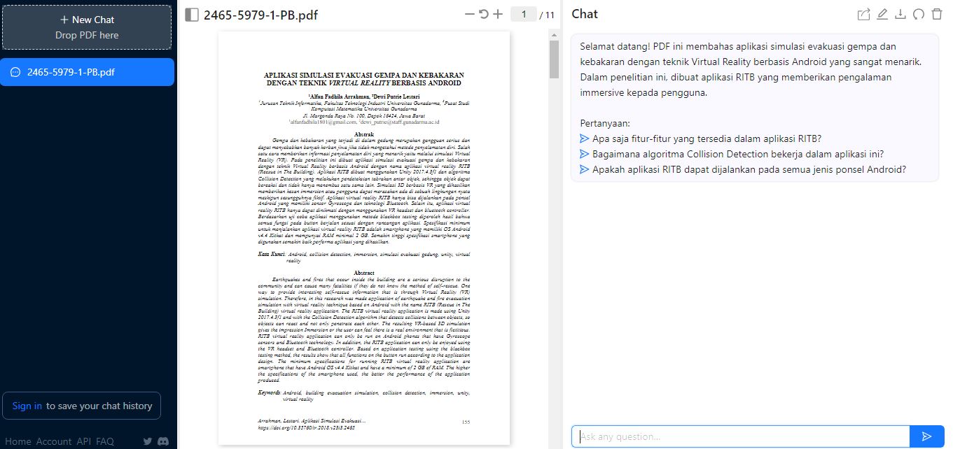 ChatPDF adalah web application yang memudahkan penggunanya untuk melakukan review jurnal secara otomatis. Pengguna tidak perlu lagi menghabiskan banyak untuk membaca keseluruhan jurnal. Cukup ajukan pertanyaan seperti “metode yang digunakan”, maka mesin AI yang ada di dalam website ini akan mencari keterangan terkait.