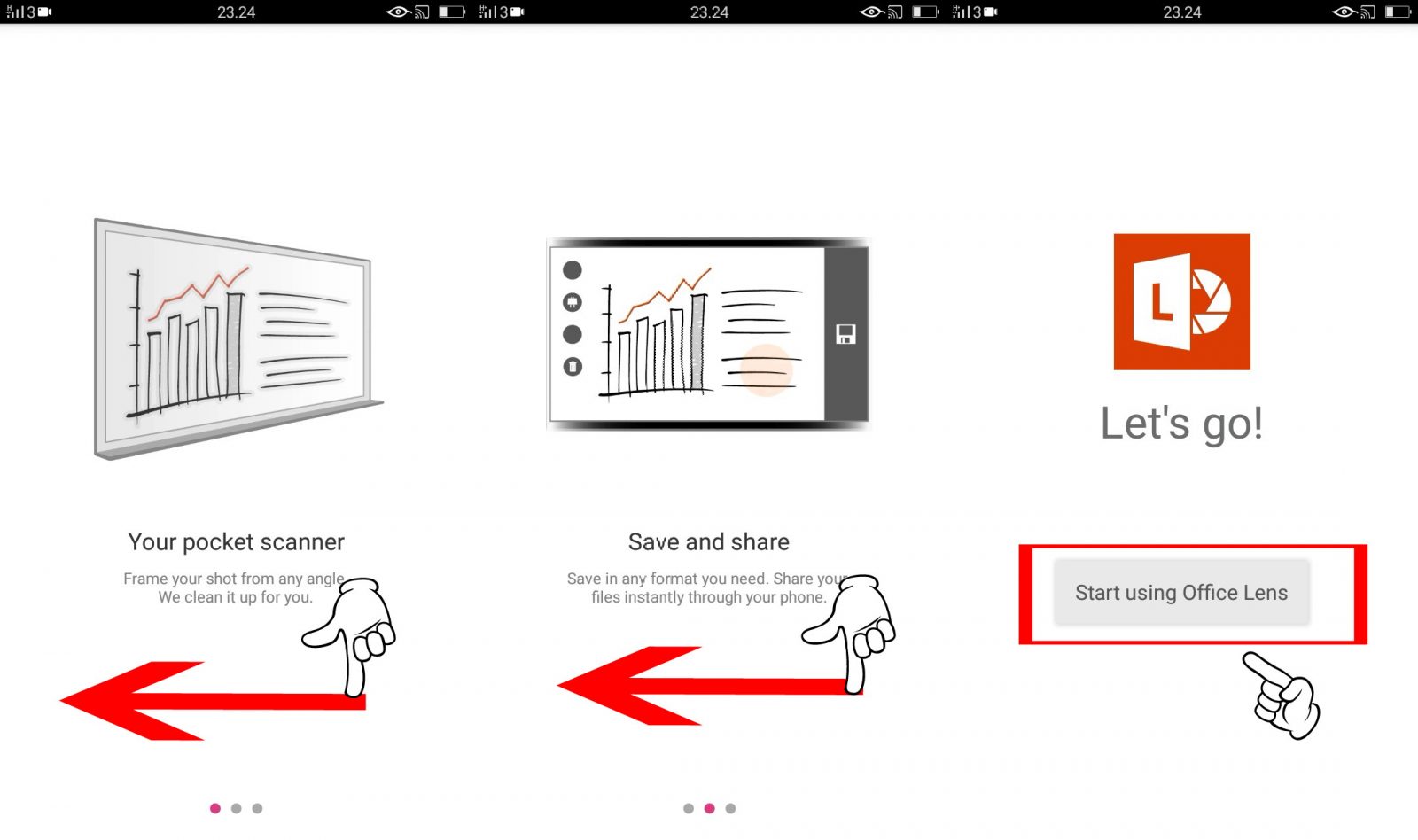 2. Lalu layar akan menampilkan beberapa pengenalan sebelum kamu mamulainya. Kamu slide saja ke kiri, hingga menemukan tombol “Start using office lens” untuk segera memulainya.