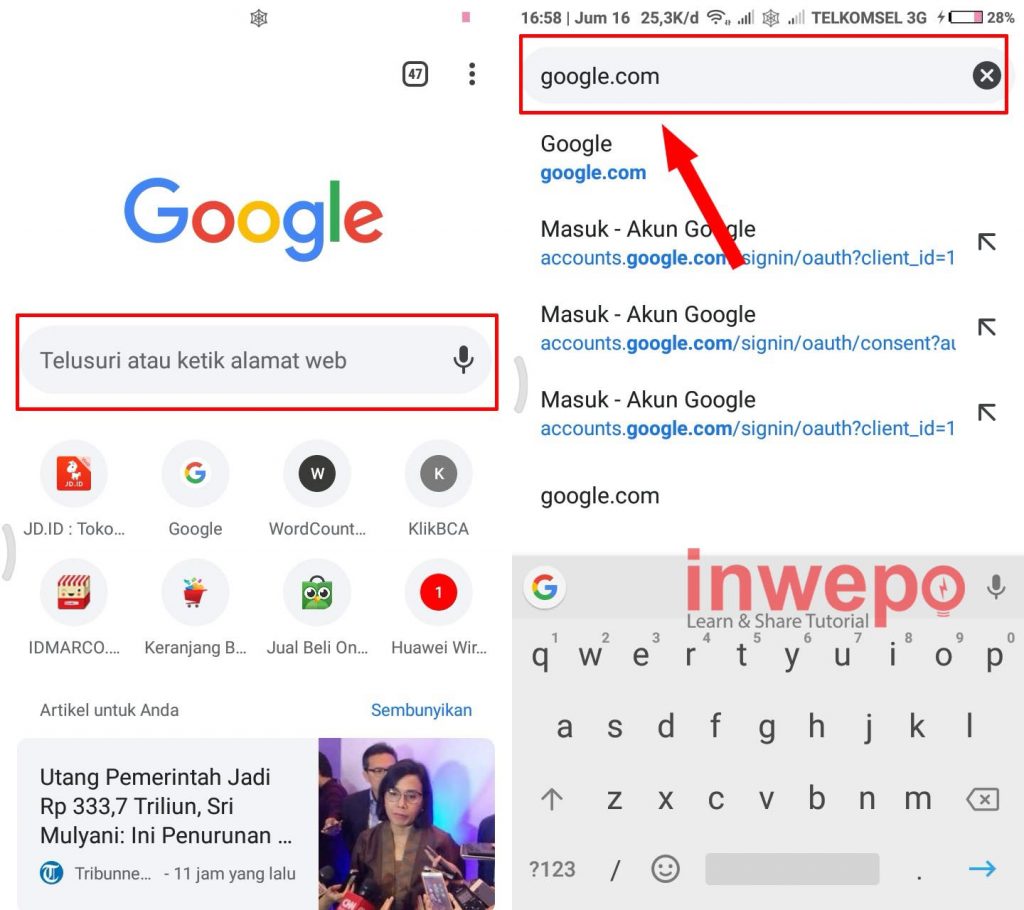 1. Langkah pertama, langsung buka aplikasi browser pada smartphone kamu (untuk tutorial kali ini saya gunakan Google Chrome). Selanjutnya pada kolom pencarian ketikkan google.com