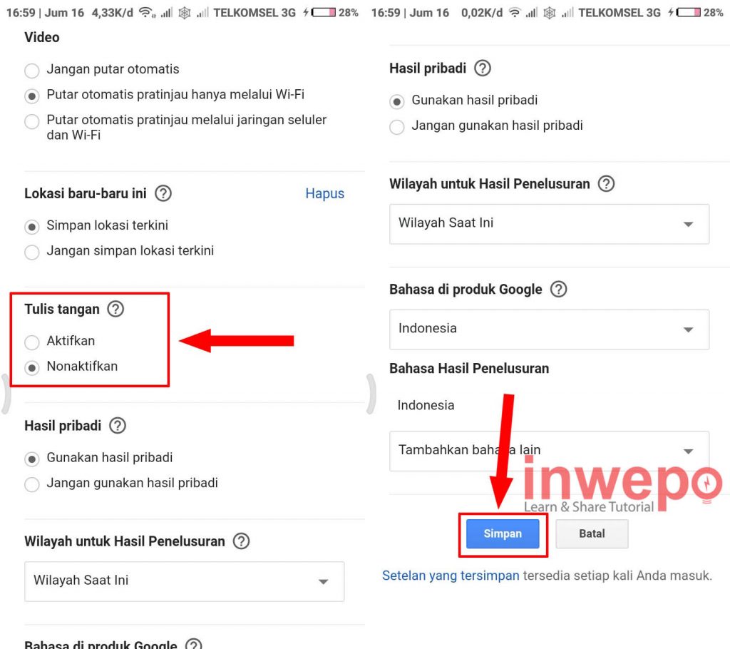 3. Langkah ketiga, scroll ke bawah pada menu Setelan penelusuran hingga menemukan menu Tulisan tangan. Kemudian pilih Aktifkan scroll lagi ke bawah dan pilih simpan.