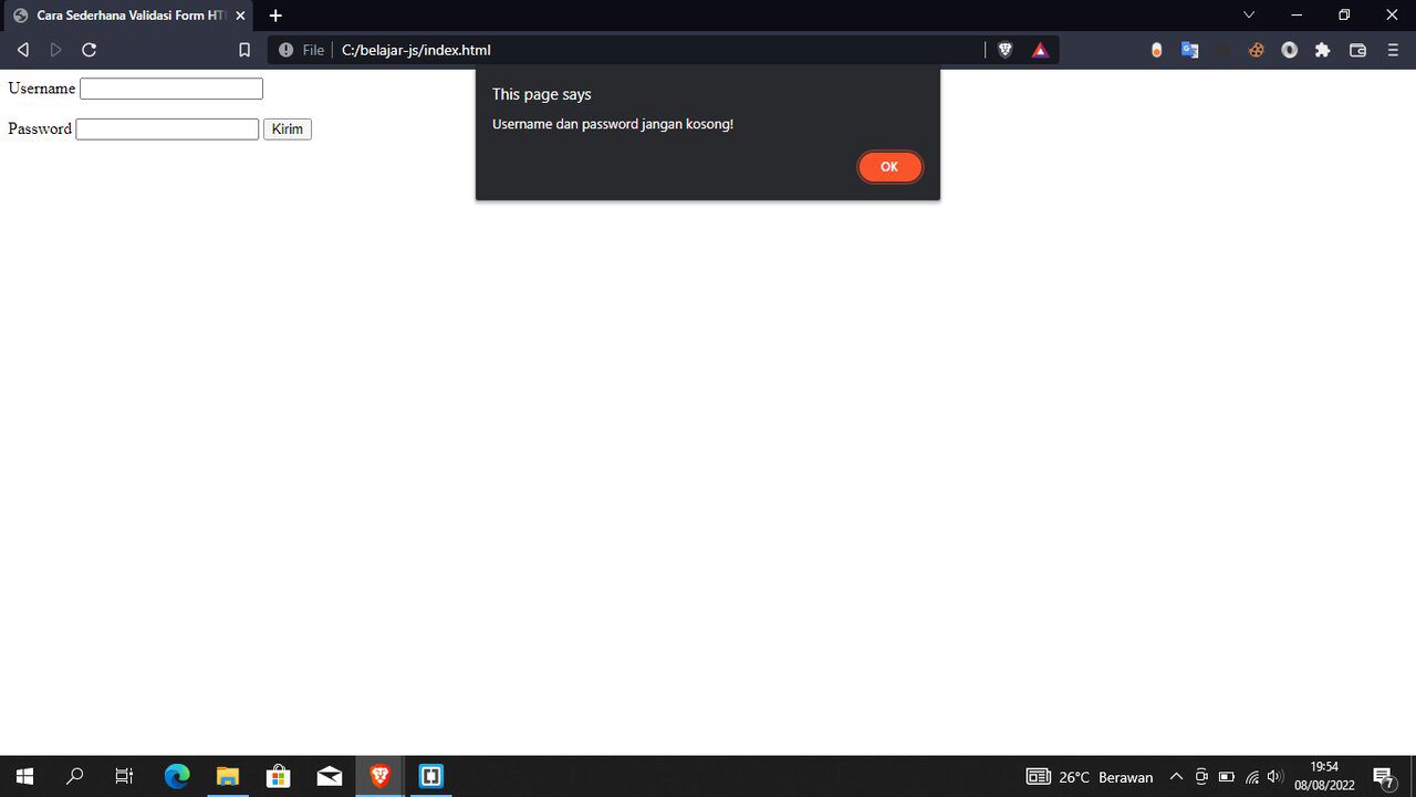 Kita akan belajar membuat validasi form html sederhana dengan bahasa pemrograman javascript dan studi kasus yang kita gunakan adalah untuk mewajibkan user untuk mengisi form html agar tidak kosong. Ini akan berjalan pada client side dan pada server side kita harus menggunakan pemrograman PHP.
