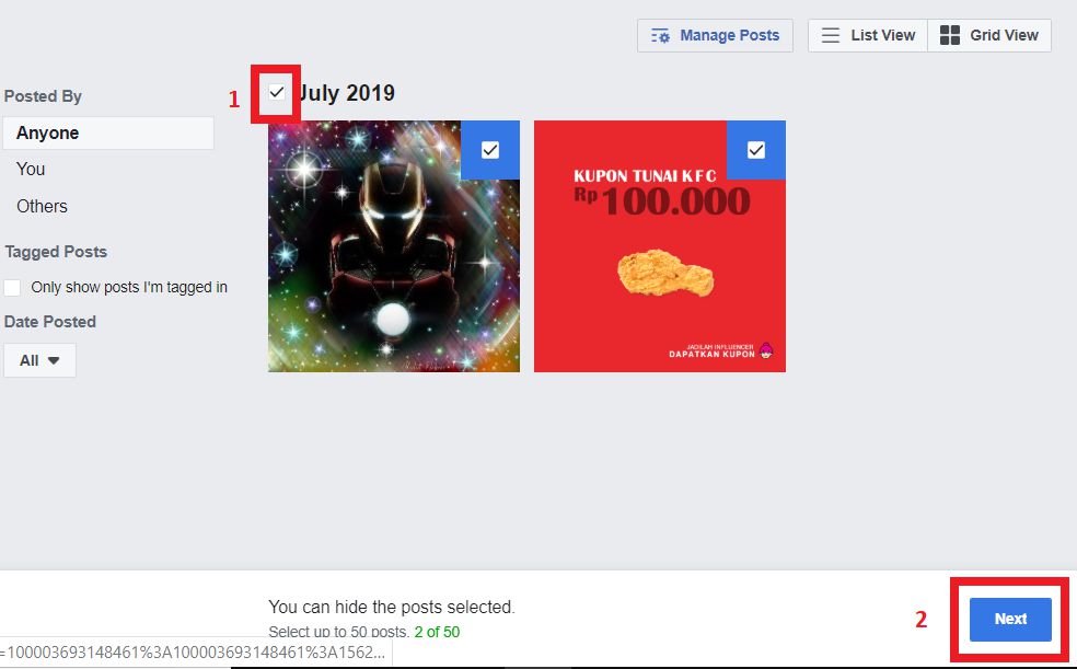 3. Kamu akan dialihkan ke halaman baru, kamu harus menunggu proses pengambilan semua status Facebook kamu, lama atau tidaknya tergantung dari jumlah status Facebook yang kamu punya, jika sudah muncul, kamu klik checkbox di samping bulan dan tahun untuk menceklis otomatis semua status pada bulan tersebut, jika kamu ingin menghapus/menghilangkan total semua status Facebook kamu, kamu beri centang pada semua checkbox yang ada. Jika sudah yakin dengan pilihan kamu, akan muncul tombol next dan kamu klik tombol tersebut.