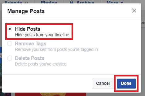 4. Akan muncul pertanyaan apakah status Facebook kamu akan dihapus atau dihilangkan saja? pada kasus penulis, jika kamu memilih semua status kamu, kamu hanya bisa memilih opsi menghilangkan status saja, jika sudah kamu pilih kamu klik tombol Done.