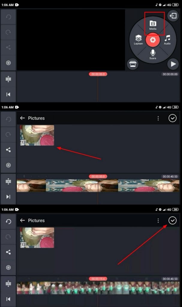 3. Pencet tombol media dan sisipkan video dari galeri yang akan di edit untuk di sensor lalu klik icon ceklis di pojok atas.