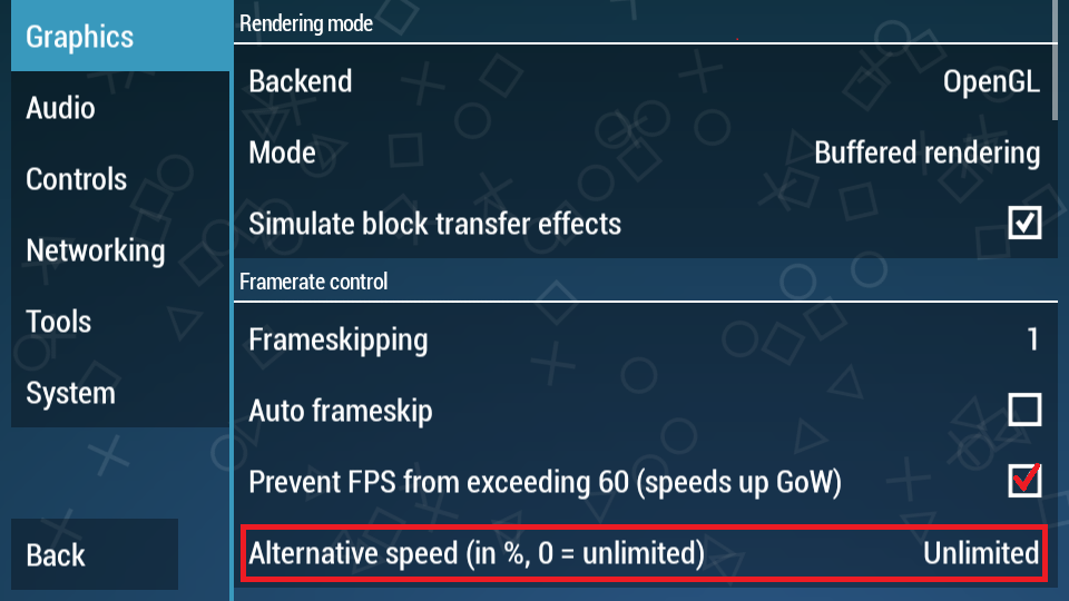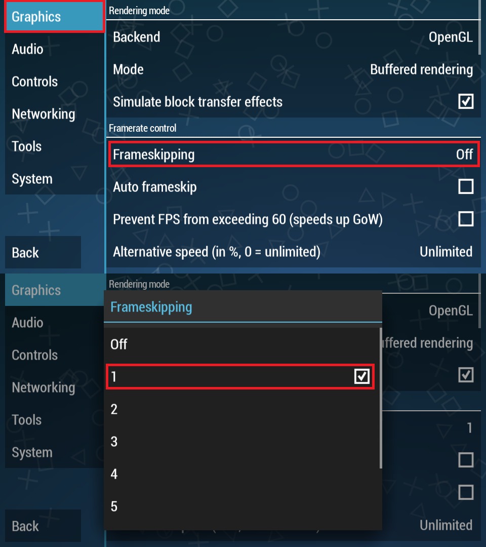 2. Selanjutnya, pada bagian Graphics, kita klik Frameskipping dan ubah dari Off, menjadi nomor 1.