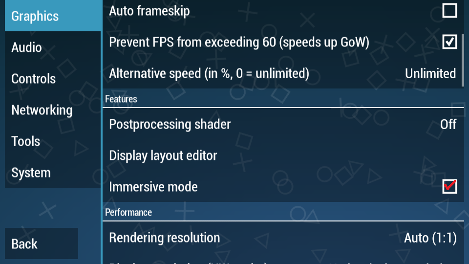 5. Scroll ke bawah, yaitu bagian Performance. Untuk Rendering resolution kita ubah menjadi Auto (1:1). Lalu, ceklis semua kotak yang ada, kecuali Software skinning.