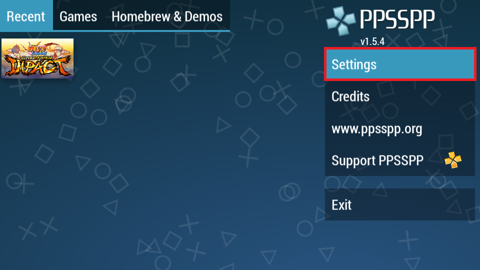 1. Buka aplikasi PPSSPP, lalu klik Settings.