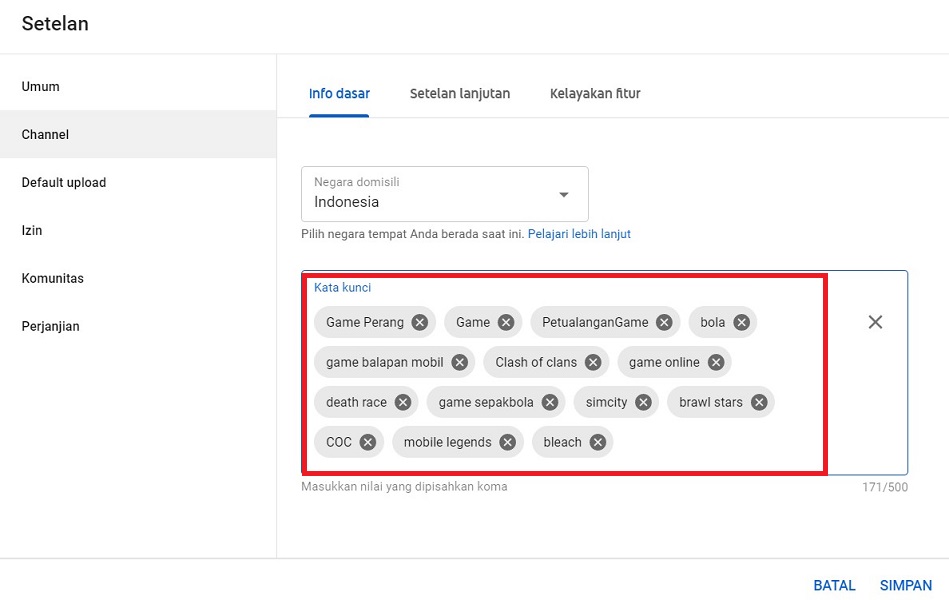 Dimenu tersebut, silahkan kamu isi kata kunci yang berkaitan dengan channel Youtube kamu. Misalnya kamu suka bermain game Mobile Legends, maka kamu wajib mengisi kata kunci yang berkaitan dengan game tersebut.