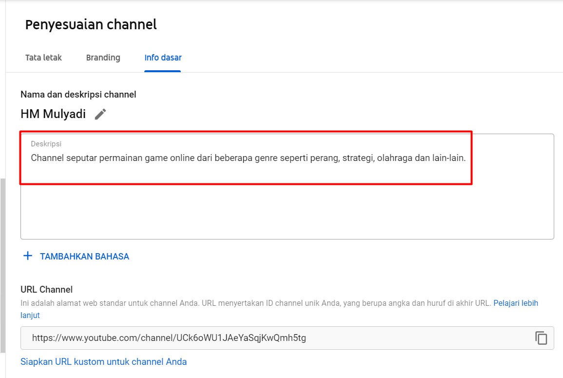 Kamu wajib untuk mengisi deskripsi mengenai informasi dari channel Youtube yang kamu jalankan tersebut, tujuan agar pengguna tahu kalau channel yang kamu upload ini adalah berkaitan dengan tema yang kamu jalankan itu.