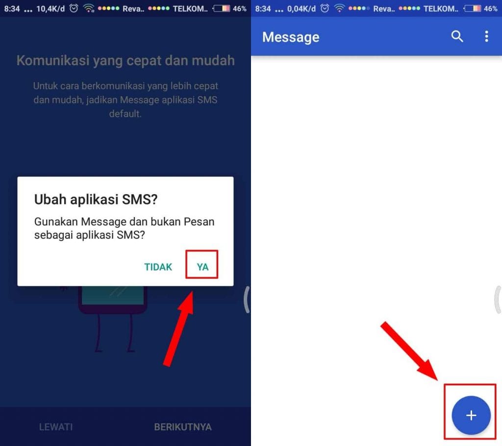 2. Buka aplikasi Android Messages yang sudah terinstall di smartphonemu, untuk pertama kali kamu akan diminta untuk mengubah aplikasi sms ke Android Messages tap saja YA. Selanjutnya tap pada icon plus untuk mulai memilih kontak dan membuat pesan baru.