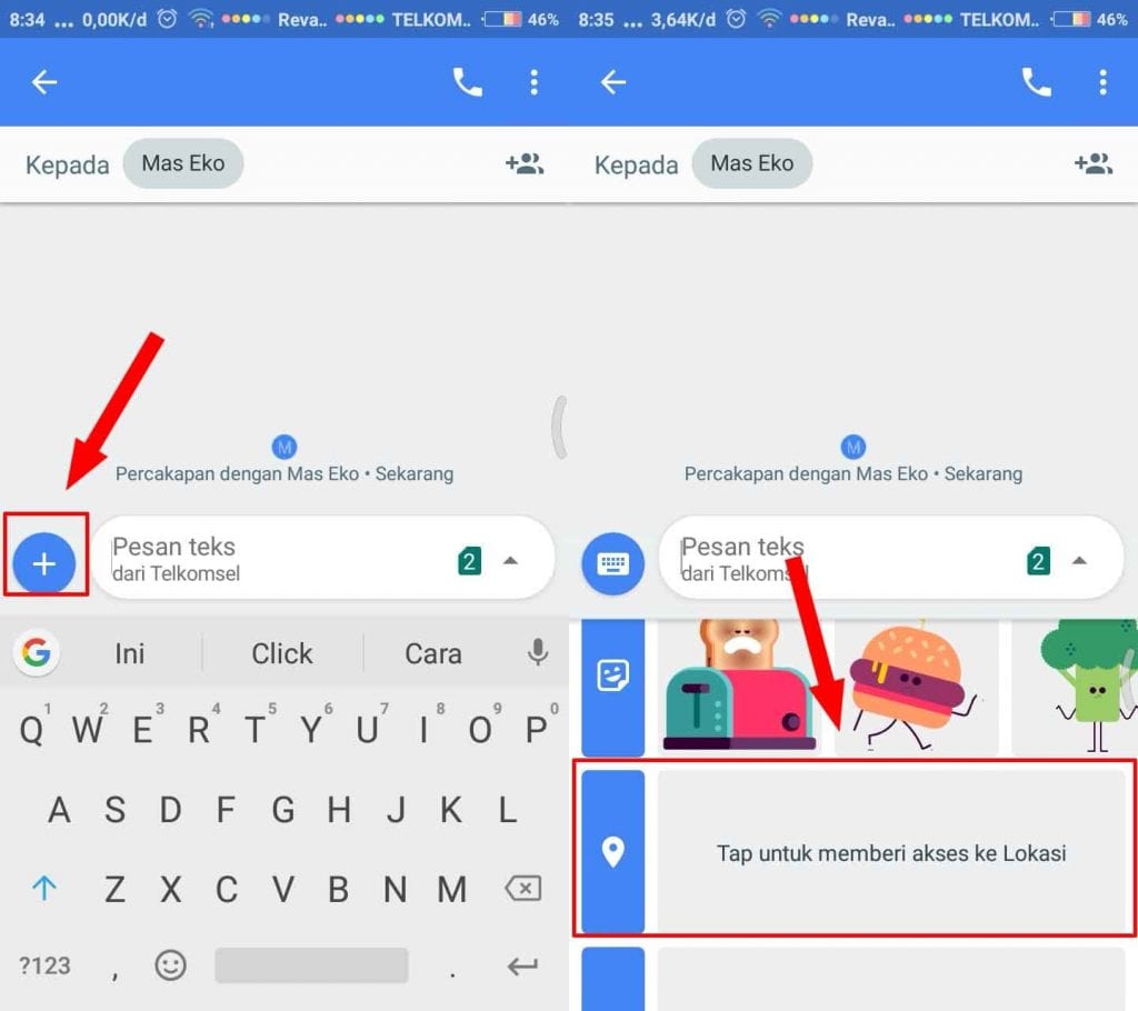 3. Tap lagi icon plus yang ada di sebelah kiri kolom teks, lalu scroll ke bawah dan pilih “Tap untuk memberi akses ke Lokasi”.