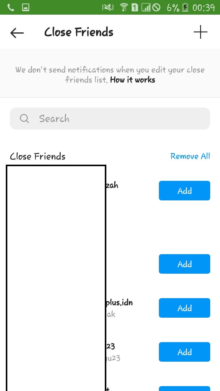 3. Instagram akan menampilkan daftar akun yang menjadi followers kamu. Gunakan tombol add untuk memasukan akun tertentu sebagai daftar di close friends.