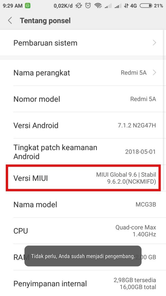 3. Untuk pengguna Xiaomi tap Versi MIUI sebanyak 7 kali (untuk device lain caranya hampir sama).