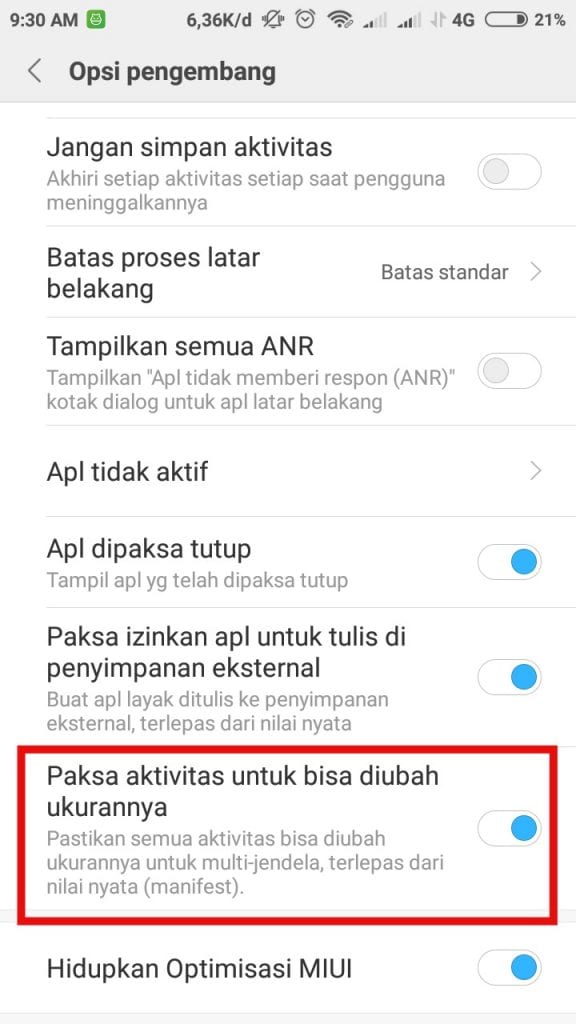 6. Gulir ke paling bawah dan aktifkan “Paksa aktivitas untuk bisa diubah ukurannya“.