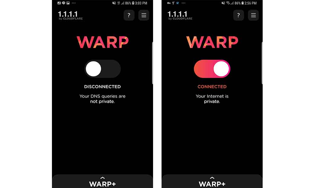 2. Setelah terinstall, buka dan nyalakan dalam mode WARP (Mode ini bisa membuat peningkatan kecepatan internet dalam penggunaan VPN).