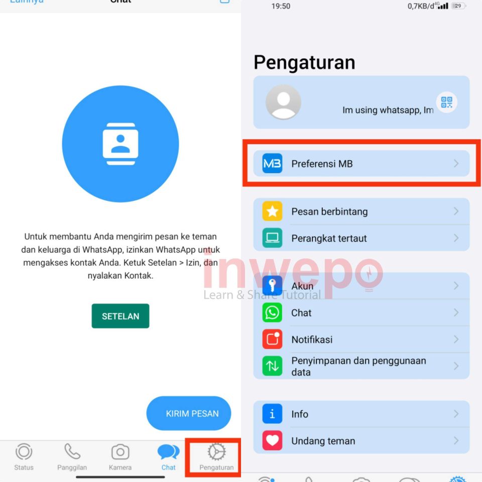 2. Jika sudah masuk ke akun WhatsApp tap icon gear atau menu pengaturan di pojok kanan bawah. Setelah itu tap menu Preferensi MB untuk masuk ke menu lanjutan.