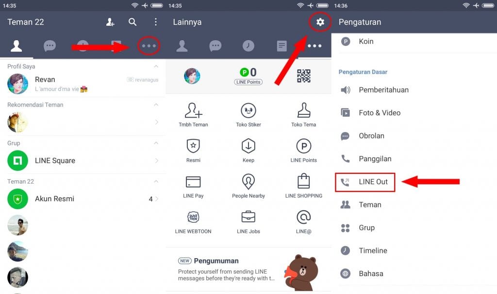 2. Masuk ke pengaturan pada menu tiga titik di pojok sebelah kanan kemudian pilih agi pada icon roda gigi, selanjutnya scroll ke bawah dan pilih LINE Out.