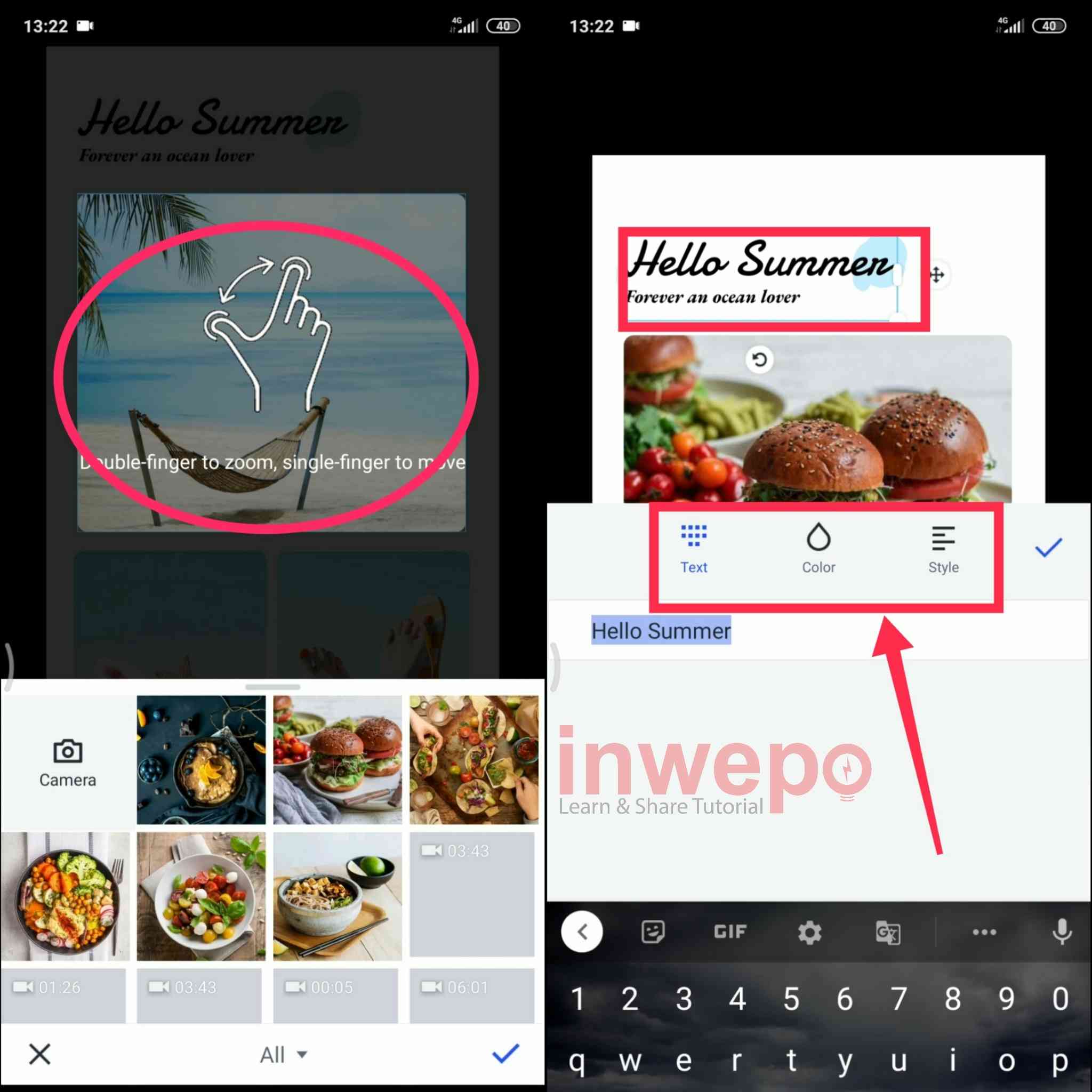 4. Langkah keempat, tap 2x pada gambar untuk menggantinya dengan yang lain. Lakukan hal yang sama untuk mengubah text. Gunakan menu Color untuk mengubah warna text dan menu Style untuk mengubah bentuk gaya font.