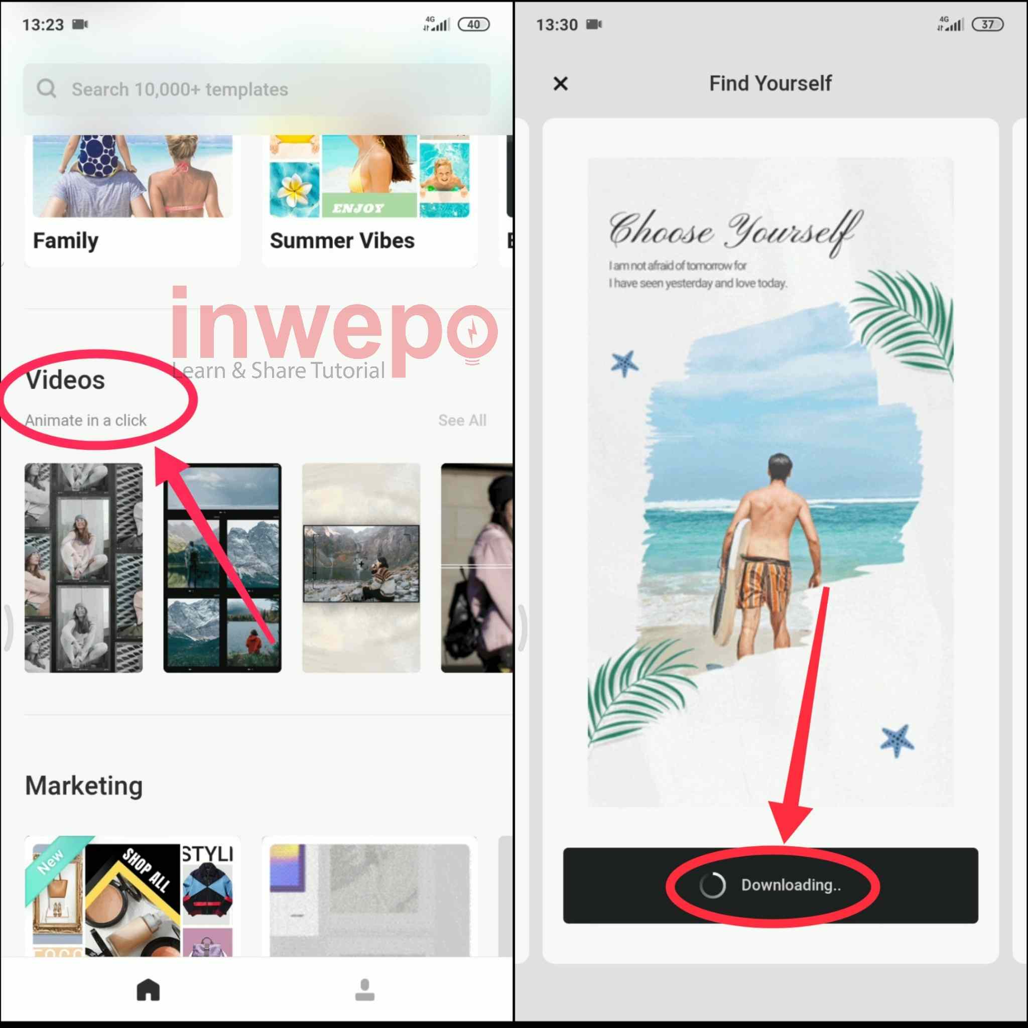 6. Langkah keenam, tap sub menu Videos untuk membuat video. Kemudian pilih template yang cocok untuk digunakan. Selanjutnya tap menu edit seperti langkah ketiga dan tunggu proses download beberapa saat.