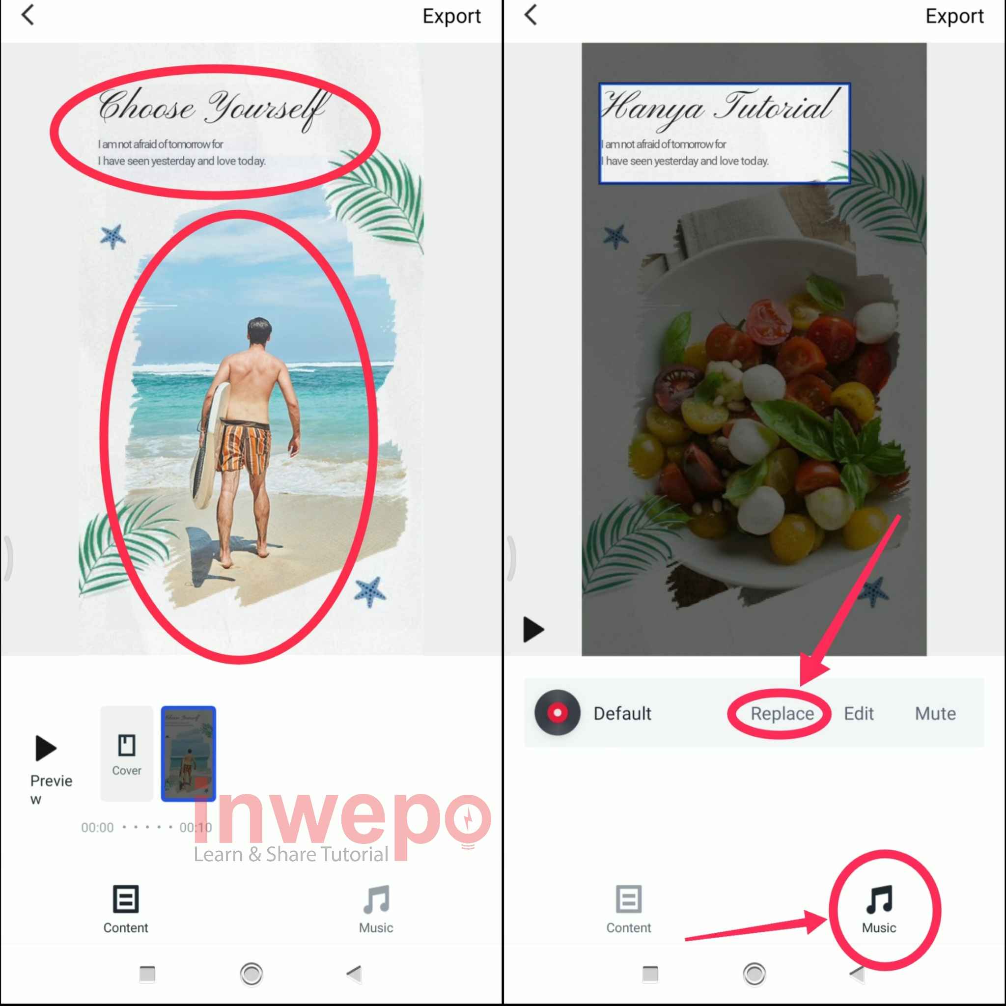 7. Langkah ketujuh, tap di bagian photo untuk mengubah photo pada video. Tap tap pada text untuk mengubah text. Untuk menambahkan musik tap menu Music kemudian pilih Replace.