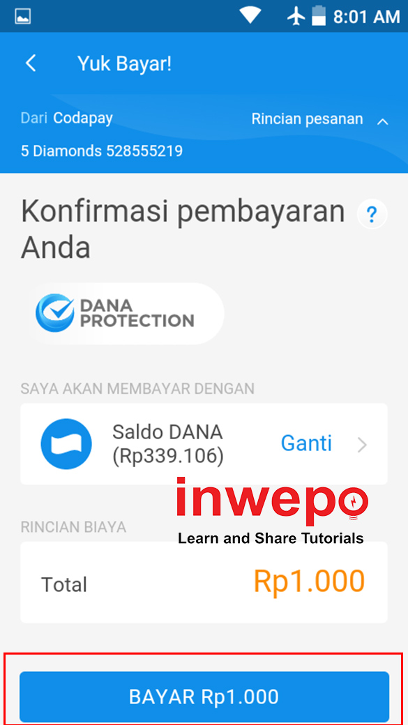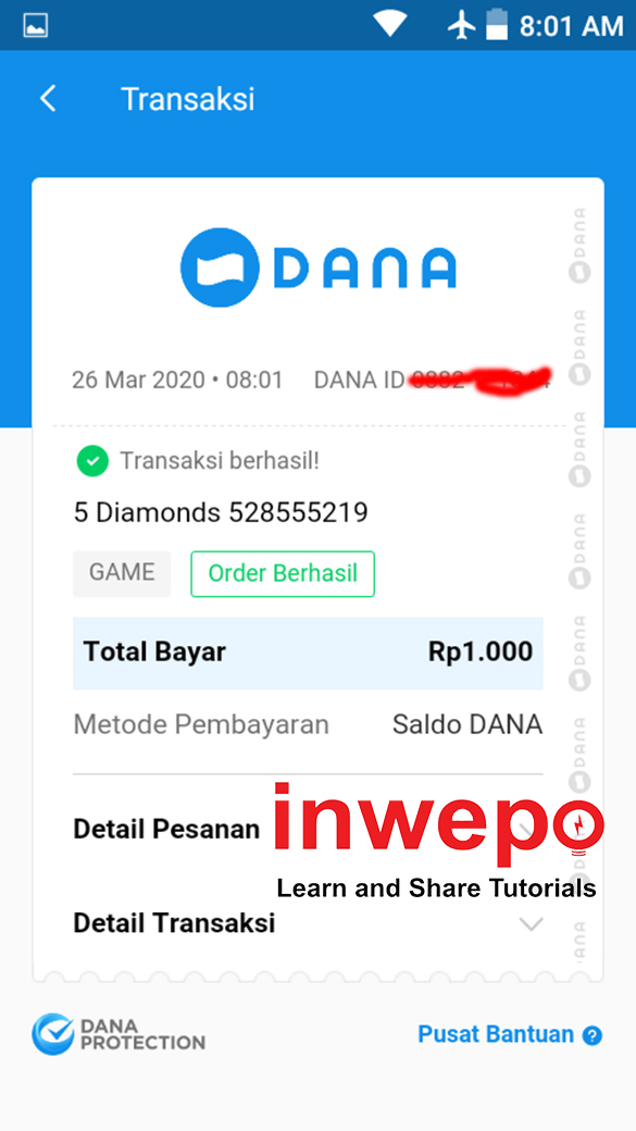 7. Dan, kamu sudah berhasil melakukan transaksi Top Up Diamond Free Fire di Aplikasi Dana.