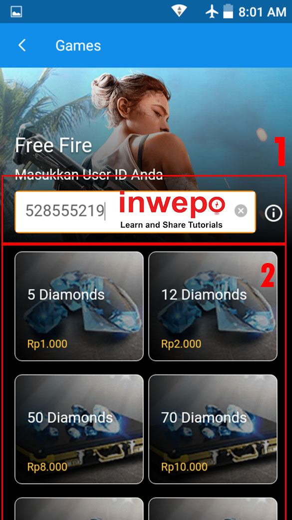 5. Langkah berikutnya, kamu masukan ID Game Free Fire kamu dan pilih Nominal Diamond yang ingin dibeli.