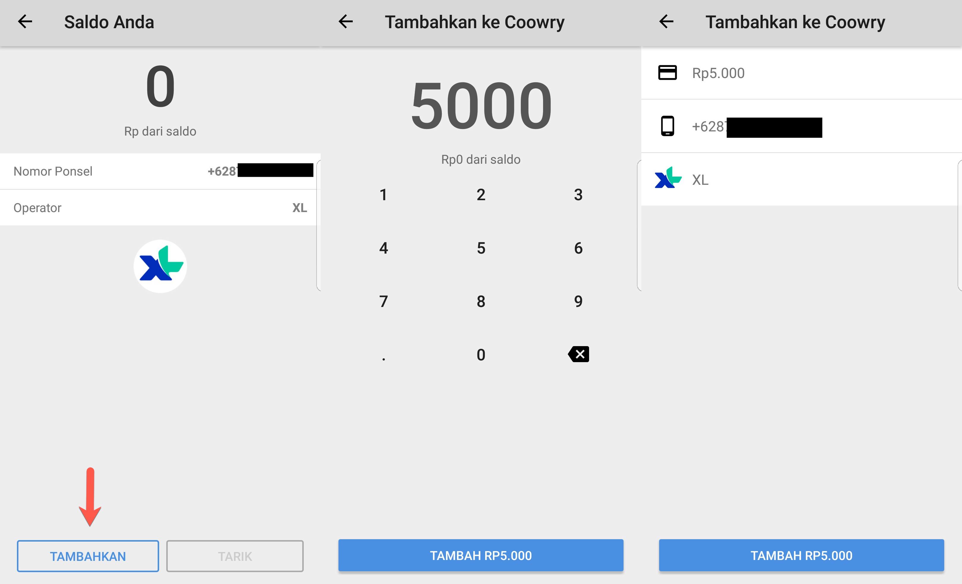 Kamu dapat menambahkan nominal berapapun ke akun Coowry, tetapi untuk menarik pulsa yang dikirim hanya tersedia 5.000, 10.000, 20.000, 25.000, 50.000 dan 100.000 (khusus operator tri bisa menarik nominal 1.000 rupiah)