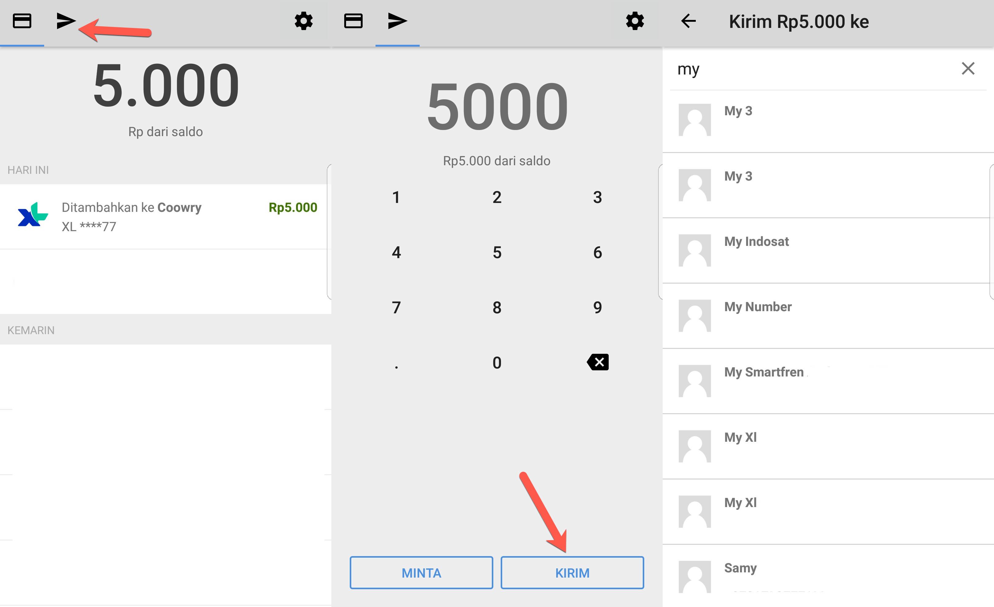 5. Setelah saldo telah masuk ke akun Coowry, selanjutnya tap icon ⇒ , masukan nominal yang ingin kamu kirim, tap tombol “KIRIM”.
