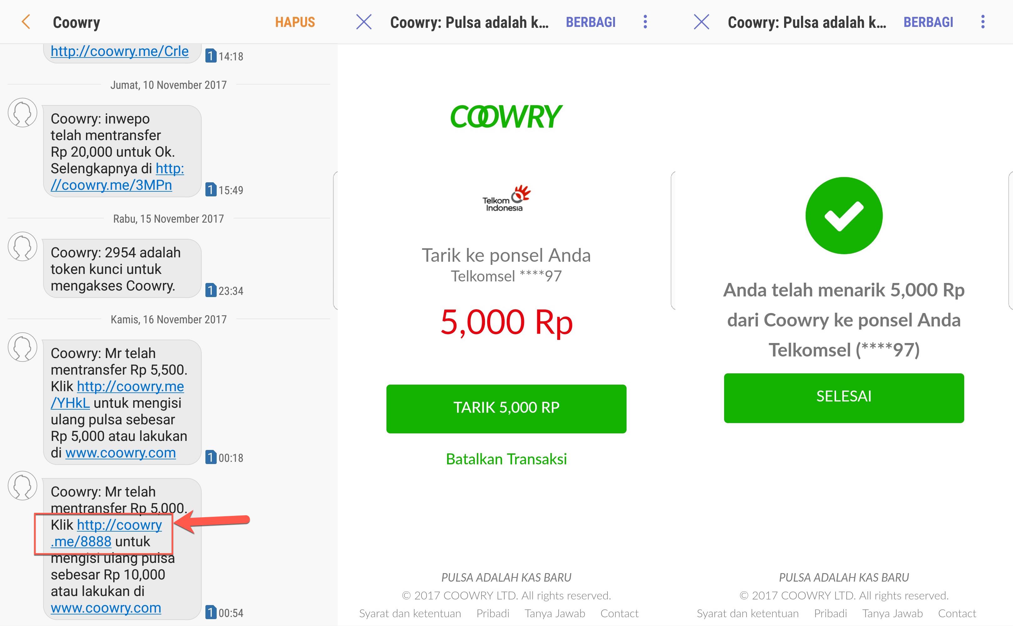 7. Selanjutnya si penerima akan menerima SMS dari Coowry, tap/buka link url yang diberikan melalui SMS tersebut. Lalu akan diarahkan ke halaman Coowry, tap tombol Tarik Rp….