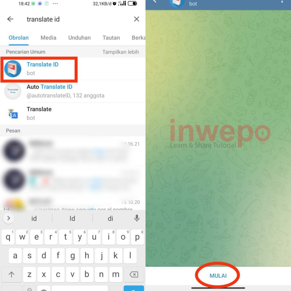 1. Buka aplikasi Telegram di smartphone kalian, kemudian ketikan dalam pencarian bot ” translate id “. Seperti yang ada di gambar berikut, jika sudah masuk ke dalam chat bot dan tap menu Mulai di bagian bawah untuk memulai bot.