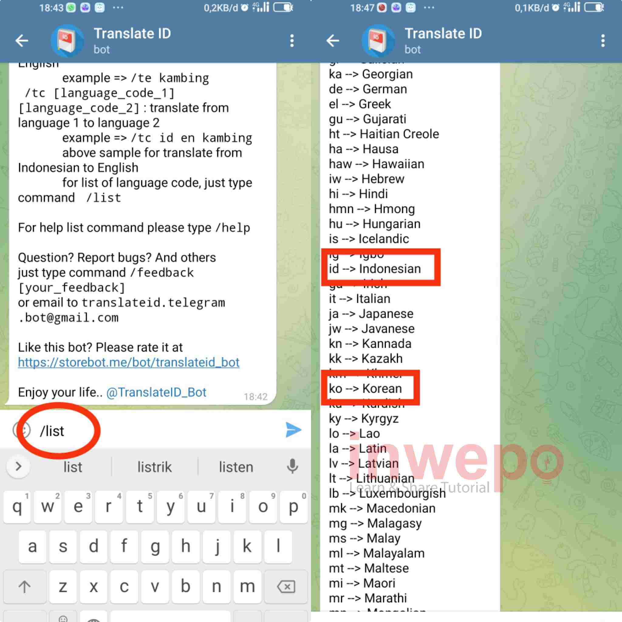 Telegram tentu banyak dari kita sudah mengenalnya bukan? Di dalam telegram sendiri terdapat sebuah fitur yang sering kita kenal yakni bot. Bot ini mempunyai kemampuan yang beragam, tinggal si developernya saja yang mengatur bagaimana dia bekerja. Salah satu bot itu juga dapat membantu kita untuk menterjemahkan atau translate bahasa yang cukup lengkap menurut inwepo adalah bot translate Id. Dimana bot tersebut dapat menterjemahkan hampir semua bahasa nasional di semua negara.