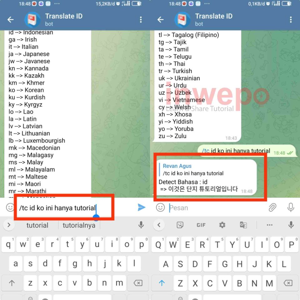 3. Ketikan perintah /tc diikuti dengan kode negara indonesia kemudian kode negara korea. Baru setelahnya ketikkan kata atau kalimat yang ingin di translate. Setelah itu bot akan secara otomatis mengirimkan hasil translate dari text yang sudah di kirim.