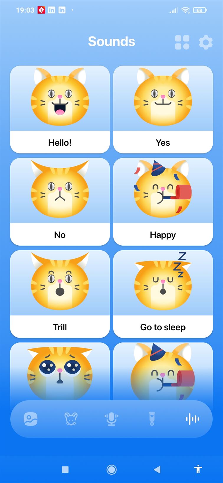 6. Apabila kamu capek harus merekam suara, kamu bisa gunakan fitur Sounds. Di dalamnya ada banyak translate kata-kata manusia untuk jadi bahasa kucing. Seperti Hello!, yes, no, Happy, go to sleep, dan lain-lain.