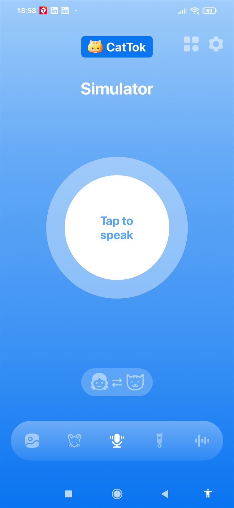 2. Setelah proses install selesai, kamu akan langsung dihadapkan dengan halaman utama CatTok – Cat Translator seperti di bawah ini;