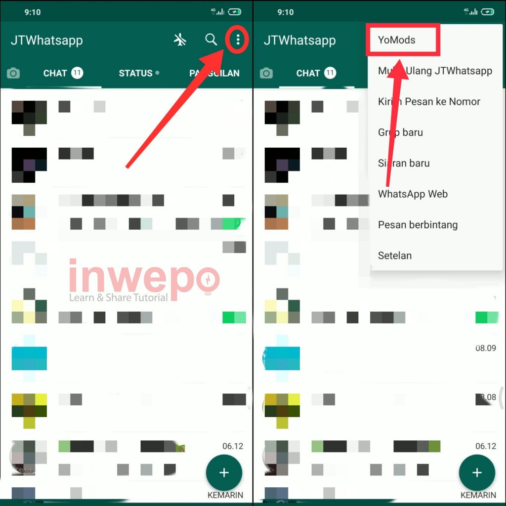 2. Langkah kedua, buka aplikasinya dan login ke akun WhatsApp kamu seperti biasanya kemudian tap 3 titik yang berada di pojok kanan atas lalu tap YoMods.