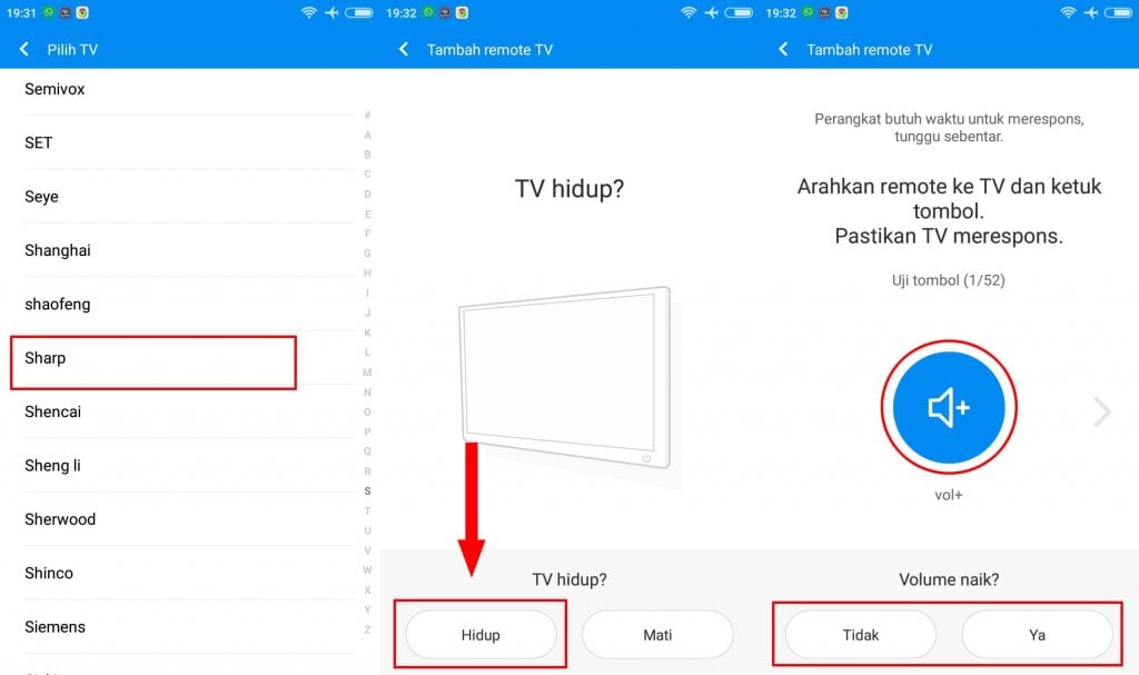 2. Selanjutnya pilih merek TV yang kamu gunakan, Pada contoh ini menggunakan Sharp. Nanti akan ada test pengujian tombol jadi jawab sesuai keadaan apakah TV kamu merespon atau tidak. Dan jangan lupa untuk mengarahkan smartphone kamu ke arah TV.