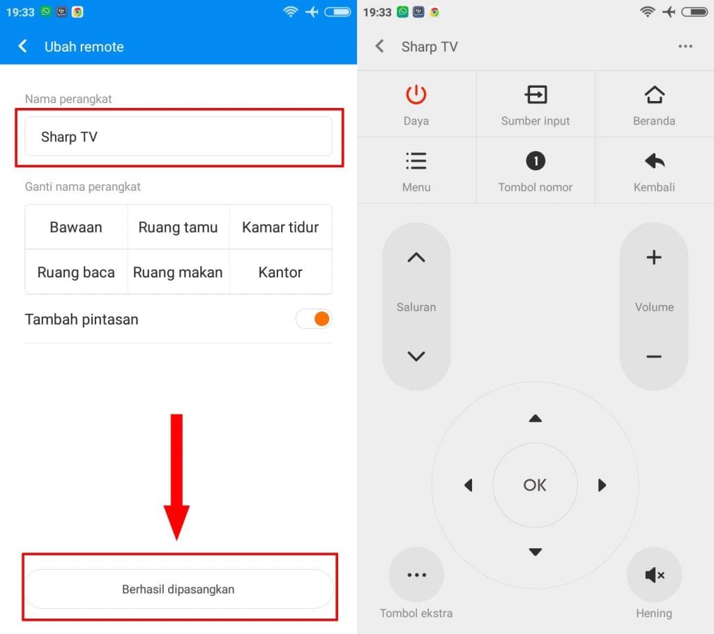 3. Bila test pengujian tombol sudah berakhir kamu akan diarahkan untuk mengganti nama perangkat kemudian tap saja Berhasil di pasangkan. Maka tampilan remote=nya akan keluar seperti gambar di bawah ini.