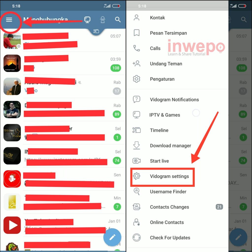 2. Langkah kedua, buka aplikasinya dan masuk ke akun Telegram masing-masing. Jika sudah tap 3 garis yang berada di pojok kiri atas lalu tap lagi menu Vidogram Settings.