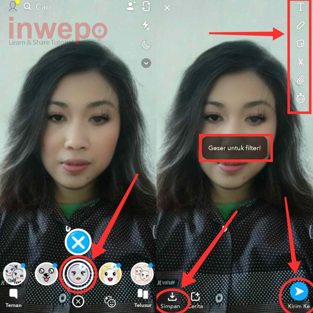 4. Secara otomatis foto kamu akan berubah menjadi wanita. Tap lagi pada icon efek kamera, kamu bisa menambahkan text dan yang lain menggunakan menu di sebelah kanan. Untuk mengganti filter tinggal geser-geser saja. Dan untuk menyimpannya ke galeri smartphone cukup tap Simpan. Atau jika kamu ingin membagikan langsung saja tap menu Kirim ke.