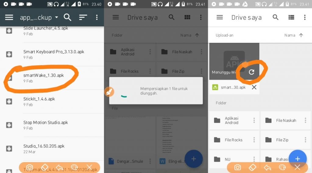 3. Untuk meng-upload aplikasi atau file yang kamu butuhkan, kamu tap tombol tambah di pojok kanan bawah, lalu pilih icon upload – Unggah. (pastikan koneksi internet sudah aktif).