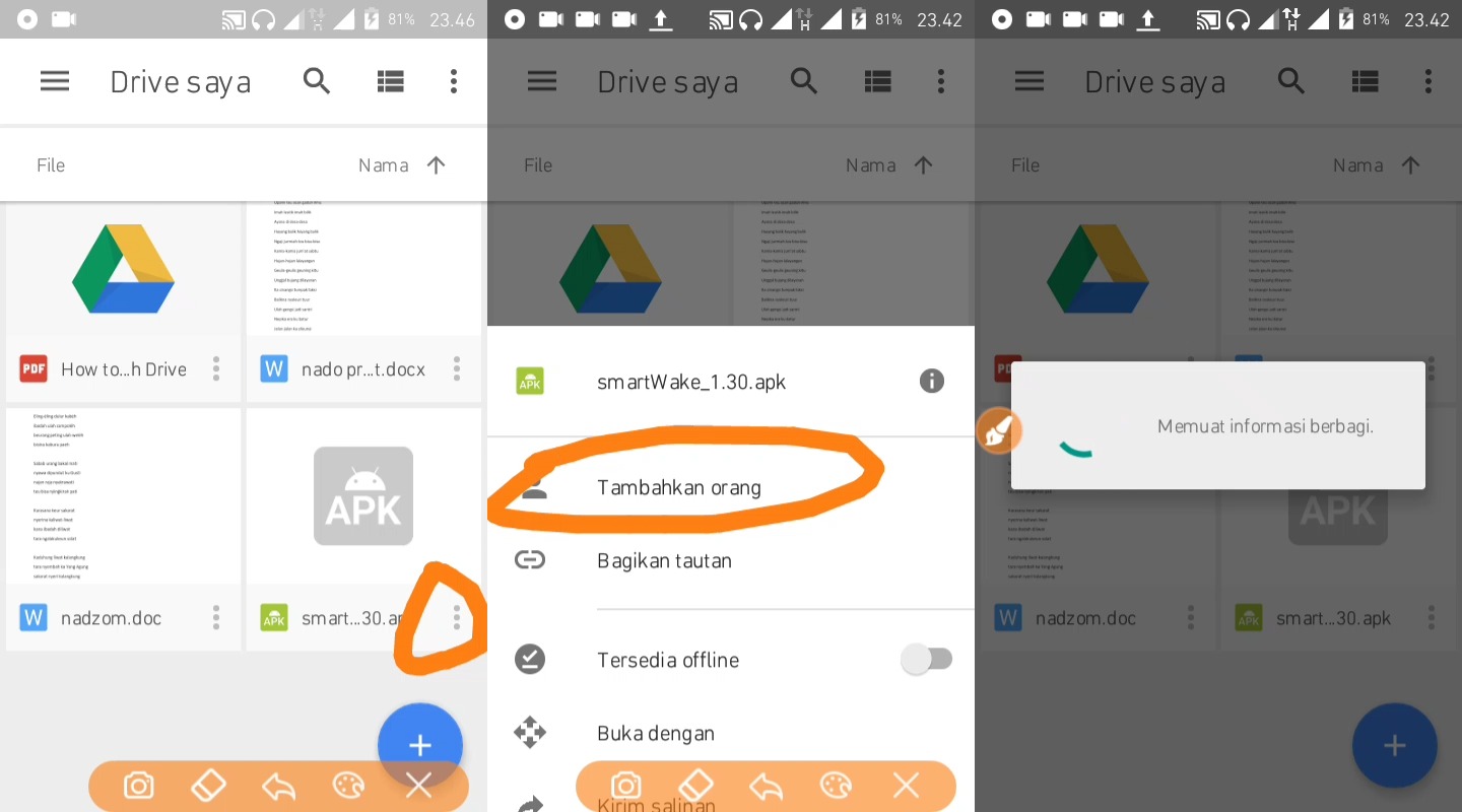 6. Biasanya jika kita tidak memberikan izin akses file kita ke publik atau umum, orang lain tidak akan bisa melihat atau mengunduh file kita di Google Drive. Agar file kita dapat di download dan diakses oleh orang lain langkah yang pertama tap titik tiga pada pojok aplikasi yang akan di buka untuk umum, lalu tambahkan orang.