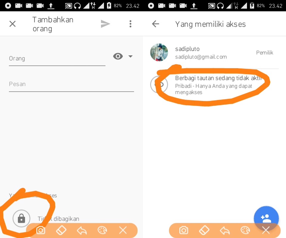 7. Pilih icon gembok di bawah layar – tap kolom berbagi tautan. Setelah proses selesai, file kalian sudah terbuka untuk umum. Namun hanya pada file yang di atur dengan langkah-langkah seperti ini saja. Jika belum di atur, file pribadi kamu tidak dapat diakses oleh publik dan tetap aman.